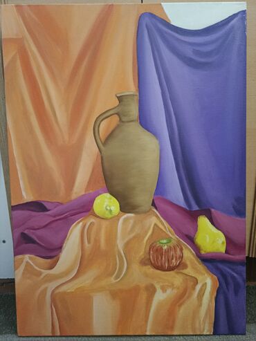 Yağlı boya natürmort tablo Yaşıl və bənövşəyi parçalar fonunda klassik