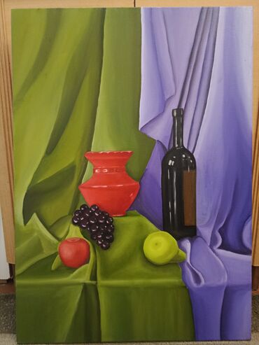 Yağlı boya natürmort tablo Yaşıl və bənövşəyi parçalar fonunda klassik natürmort kompozisiyası. Kompozisiyada qara şüşə butulka, parlaq qırmızı keramika qab, üzüm salxımı, armud və alma yer alır. -...