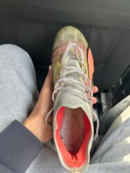 Məhsul: Futbol butskası (ştiftli) Təsvir: - Rəng: Ağ əsas üzərində qara konturlar və rəngli (çəhrayı, sarı, mavi) damarvari naxışlar - Dizayn: Yan tərəflərdə qara xətt detalı, daban hissəsində et...