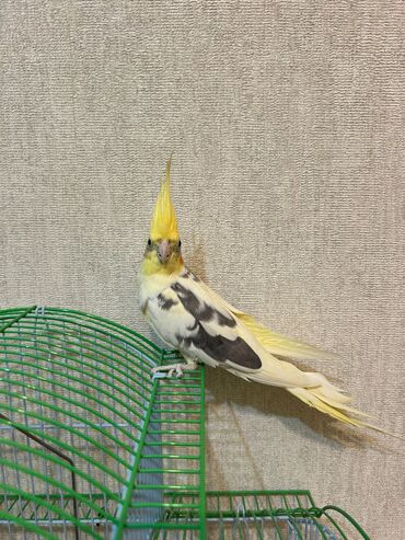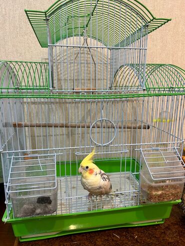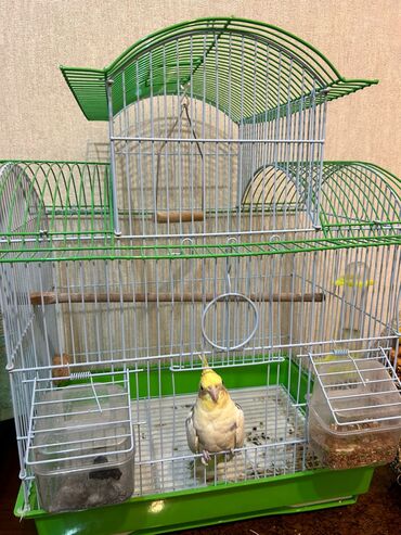 Nimfa (Cockatiel) tutuquşusu və qəfəs dəsti - Növ: Nimfa (cockatiel) – sarı taclı, yanaqlarda narıncı ləkələr - Rəng: yaşıl-boz naxışlı qanadlar, sarı baş və quyruq ucları - Aksessuarlar: metal qə...