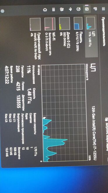 - Prosessor: 12th Gen Intel Core i7‑1255U (10 nüvə, 12 axın). Baza/işçi tezliyi Task Manager-də görünür.