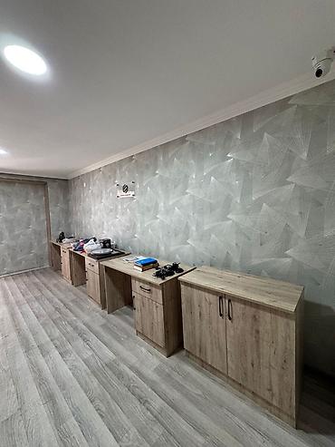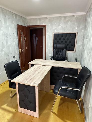 - Rəhbər masası və köməkçi yan masa: eyni dekorla (açıq ağac teksturası), ön panellərdə qara kapitonaj aplikasiyalar. Geniş iş səthi, sənədlər və kompüter üçün rahat yerləşim.