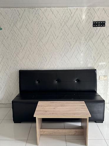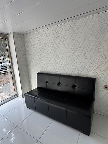 - 3 nəfərlik qara eko–dəri divan: yüksək kürəklikli, düyməli kapitonaj işləməli, düz xəttli modern dizayn. İctimai yerlər və gözləmə zonaları üçün əlverişli. Asan silinən, nəmə davamlı örtük.