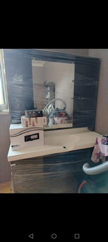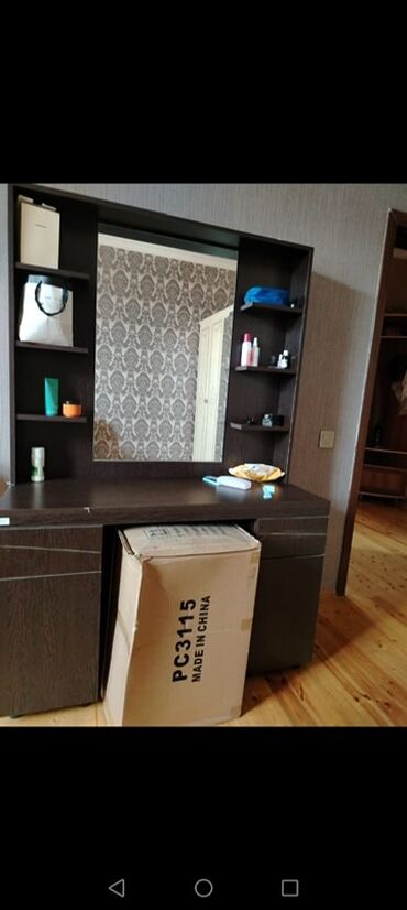 - Masa: tünd ağac fakturalı səth, çoxsaylı rəflər və böyük güzgü