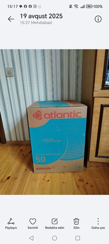 - Su qızdırıcısı: Atlantic markası, elektrikli, 50 litr həcm. Qutudadır.
