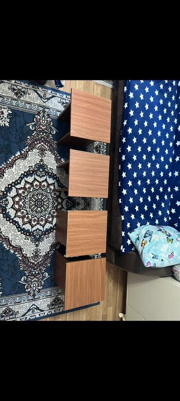 - Dəst tərkibi: iri ölçülü yan və arxa panellər, bir neçə rəf/şüa formalı hissə, masa/komod üçün alt əsas və silindrik dayaqlar. Hissələr üzərində yığma üçün işarələr və hazır açıq vint dəlikləri var.