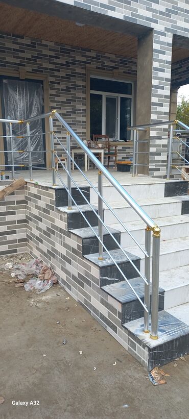 Paslanmayan poladdan (inox) pilləkan və eyvan məhəccərləri - Material: parlaq inox/profil borular, qızılı dekorativ birləşdiricilər və başlıqlar - Konstruksiya: ikiqat dayaqlı sütunlar, 3–4 üfüqi ...