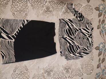 İki hissədən ibarət qadın geyim dəsti - Üst: qısa top, çiyinlərdə kəsik detallı, asimmetrik bədən hissəsi açıq dizayn. - Ətək: yüksək belli, uzun/maxi ölçü, geniş kəsim, elastik bel hissəsi. -...