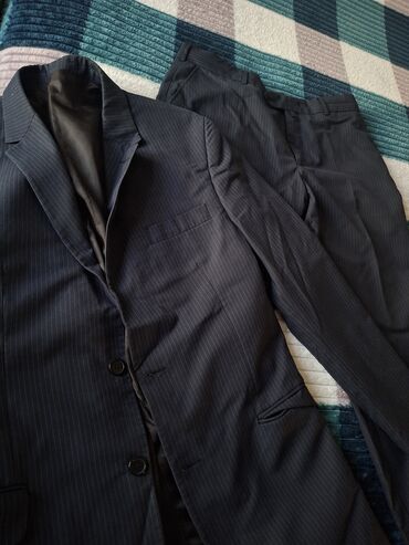Kişi kostyumu – iki parçalı - Rəng: tünd boz, incə xətli (micro-check/çizgili) naxış - Model: 2 düyməli klassik pencək, dar krujevalı (notch) yaxa - Pencəkdə: sinə cibinin üstü (bilet cibi görünüş...