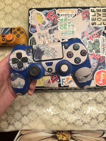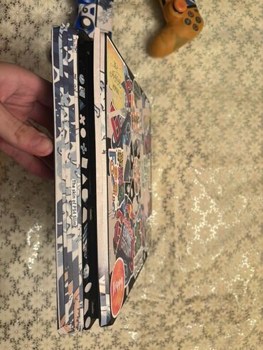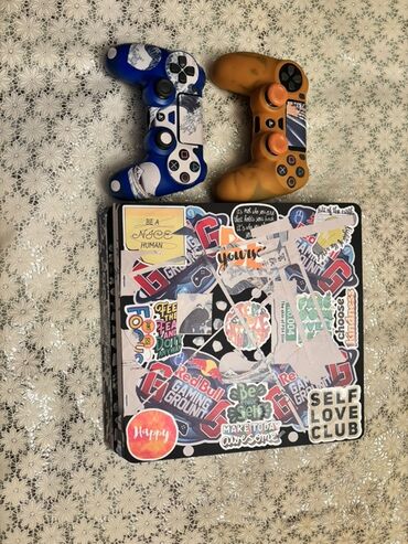 - Üzərində tematik stikerlərlə bəzədilmiş qoruyucu skin (yanlarda “The skin of PS4 Slim” yazısı görünür)