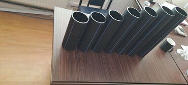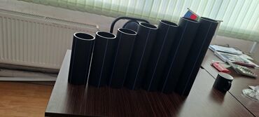 Qara rəngli, müxtəlif diametrli yeddi ədəd polietilen boru dəsti. Borular su təchizatı, kanalizasiya və ya digər inşaat işləri üçün yararlıdır.