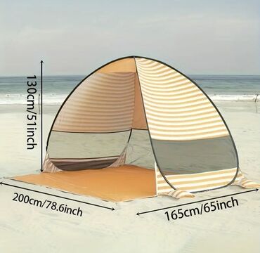 - Material və quruluş: Öz-özünə açılan (pop-up) elastik karkas; qum cibləri və kənar bağlama nöqtələri ilə sabitlənmə imkanı; inteqrə edilmiş döşəmə.