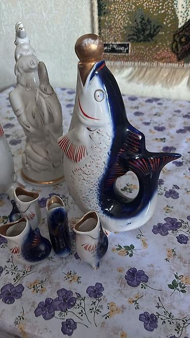 Porcelain balıq formasında sovet dövrü içki dəsti - Material: yüksək keyfiyyətli farfor/porcelain - Dizayn: böyük balıq formasında qrafin (üstü qızılı rəngli qapaqla), yanlarında kiçik balıq forma...