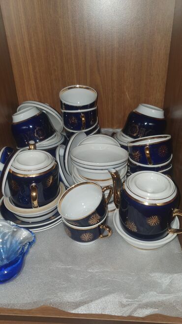- Klassik dizaynlı porselen çay-servis elementi: tünd lacivərt fon üzərində qızılı ornamentlər, qızılı kənar haşiyələr və qulplar. Dəstdə fincanlar, fincan altlıqları, kiçik boşqablar/kasalar və çaydan tipli qab mövcuddur. Dizayn süfrəyə zəngin və zərif görüntü verir, qonaqlamalar üçün uyğundur.