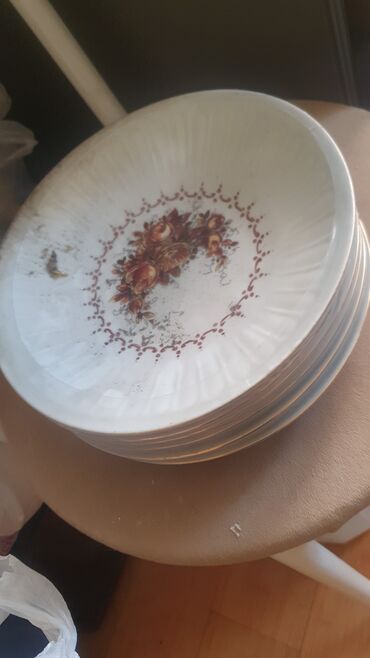 - Ağ porselen yemək boşqabları: ortasında meyvə-buket illüstrasiyalı klassik naxış, kənarlarda rellefli/falçalı forma. Bir neçə ədəddən ibarət yığın şəklindədir və gündəlik istifadə və ya servis üçün yararlıdır.