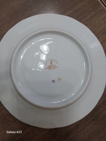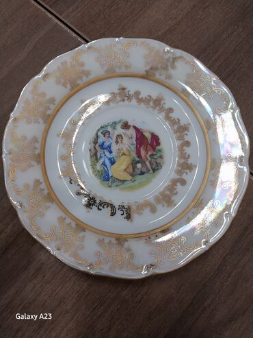 Kobalt mavi kənarlı, qızılı ornamentli porselen boşqablar dəsti. - Material: incə porselen - Rəng: ağ mərkəz, kobalt mavi haşiyə, qızılı kontur və naxışlar - Dizayn: klassik barokko motivləri; bir...