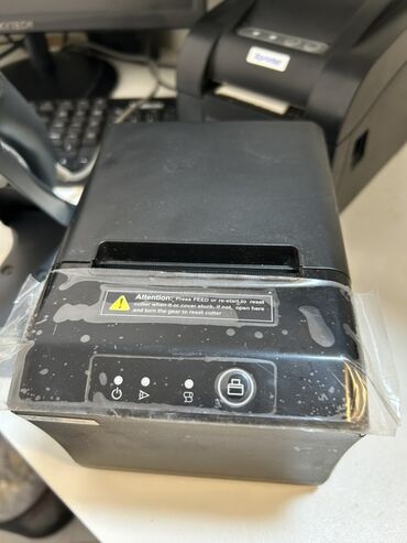 - Termal printer 2: Avtomatik kəsici (cutter) göstəricili termal çek printeri. Üzərində işə salma, xəbərdarlıq, kağız statusu və çap düymələri olan idarə paneli var; “Press FEED or re-start to reset cutter…” təlimatı göstərilib.