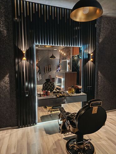 - Müasir interyer, vintage bərbər kresloları, geniş güzgü zonası