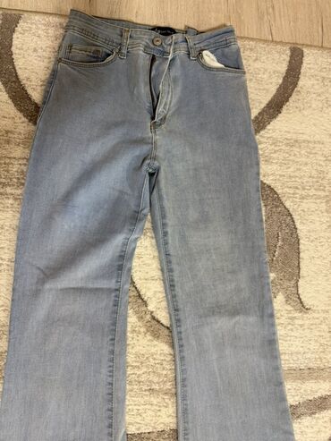 Mavi rəngli, açıq tonlarda klassik dizayna malik cins şalvar. Yüksək bel kəsimi, beliklər (kəmər üçün ilgəklər) və düymə–fermuar bağlanışı var. Ön hissədə üç, arxa hissədə iki olmaqla toplam 5 ciblidir. Kəsim baldırdan aşağı doğru genişlənən (flare/bootcut) siluetdir, gündəlik və rahat kombinlər üçün uyğundur. Yumşaq denim parça, yüngül yuyulma effekti ilə. Etiketdə “Loft” yazısı görünür. Rəng: açıq mavi. Stil: klassik 5-cibli, geniş ətək uclu cins.