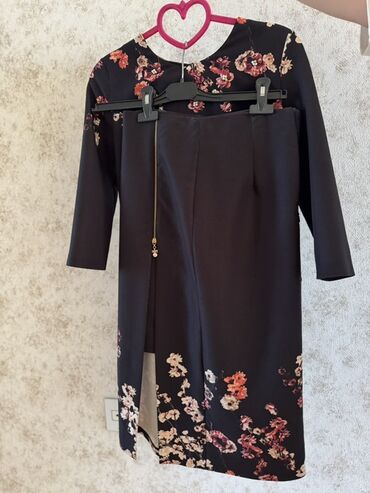 Qara fon üzərində ağ çiçək naxışlı iki hissədən ibarət qadın dəsti. Dəst uzun ətək və uyğunlaşan bluzdan ibarətdir. - Ətək: A-çəkmə siluet, qələm-ətəkdən daha rahat kəsim; yanda yarıqla hərəkət ra...