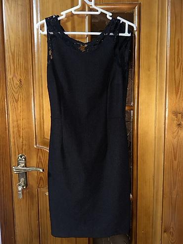 Qadın paltarı – Eventi marka 38 ölçü - Dizayn: Qara-ağ rəng kombinasiyası, sinə hissəsində qara-ağ güllü aplikasiya. Ön hissədə üfüqi bant detalları. - Kəsim: Bədənə oturan siluet, dizə yaxın uzu...