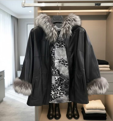 Qadın plaşı – boz rəng, qalın toxumalı parça, tünd rəngli dəri tipli