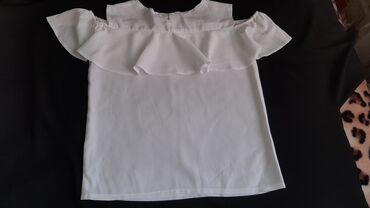 - Bluz: Ağ rəngli, nazik teksturalı parça. Açıq çiyin xətti, ön hissədə geniş volan detalı ilə romantik görünüş yaradır. Düz kəsim, rahat oturuş.