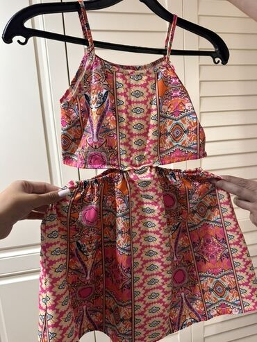 - Üst: incə ipli krujkali crop-top, yuvarlaq boyun kəsimi - Aşağı: bel hissəsi rezinli, rahat geniş ətək-şort (skort) kəsimi - Parça: yüngül, ipəkabənzər parıltılı toxuma; isti havalar üçün hava keçirən - Naxış: canlı bohem/etnik motivlər – çəhrayı, narıncı, qızılı və qara tonların kombinasiyası, simmetrik ornament və medalyon detalları - Detallar: düz tikişlər, nazik tənzimlənən çiyin qayışları, beldə usaq ucun 4,5 yas