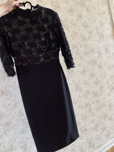 Qadın üçün qara kokteyl donu - Rəng: qara, xırda parıltılı effektli - Dizayn: bədənə oturan siluet, dizə qədər uzunluq. Boyum 1.72 sm - Bel - kürək hissəsi tünd tüllə bağlı, ön hissəsi bağlı boyun...