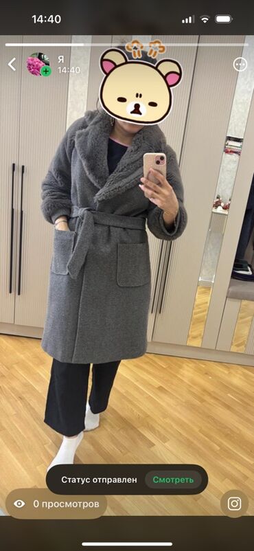 Qadın palto – klassik boz rəng, “VAZELI’S” etiketli. - Dizayn: iki cərgəli düymələmə, geniş qatlana bilən yaxalıq - Naxış: xırda “sibirka/soyuducu balığı” (herringbone) deseni - Kəsim: dizə qədər u...