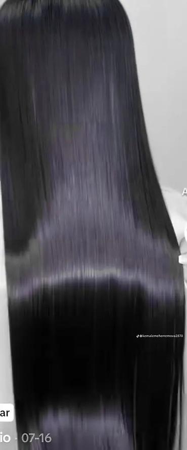 Xidmətin foto nümunələrində əvvəlki və sonrakı nəticə göstərilib: həcmli və pütövr olmayan saçlardan ipək kimi düz, yüksək parlaqlıqlı saçlara keçid.
