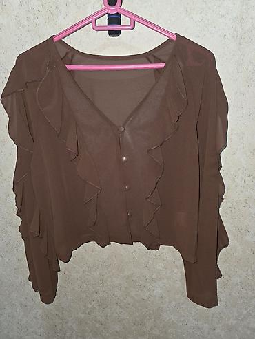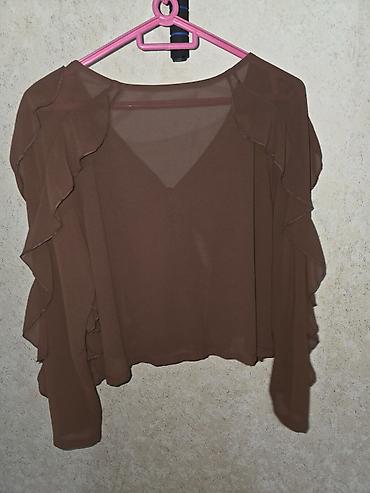 Zərif şifon bluz - Rəng: açıq çəhrayı (pastel ton) - Parça: yüngül, şəffaf şifon, ikiqat qatlı hissələr - Dizayn: V-yaxa, ön hissədə büzgülü-bağlamalı iplər, dalğalı volan detalları - Qol: uzun, ge...