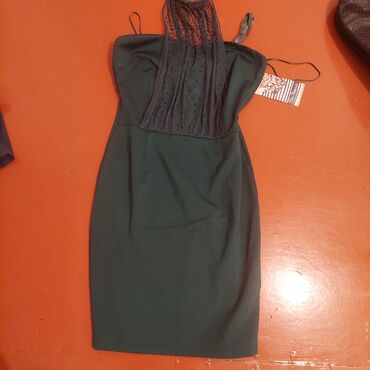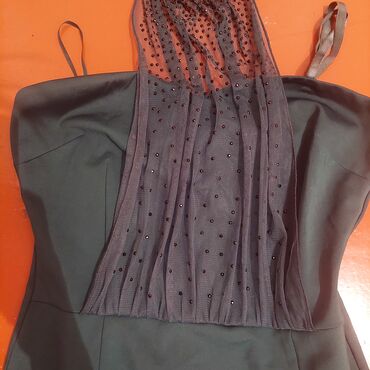 Tünd zümrüd rəngli zərif ziyafət donu. Geyim bircə dəfə geyinilib. - Model: V-yaylı dekolteli, sarıqlı (drapeli) üst hissə, beldə parlaq daşlarla bəzədilmiş yarpaq formasında aplikasiya. - Qol: ...