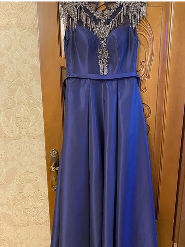 Şık, klassik siluetlə diqqətçəkən bəzəklərin və dərin göy tonunun harmoniyası. Arxası şleyf kimi