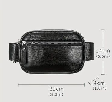 Qara rəngli çiyin/kəmər çantası - Material: toxumalı qara eko‑dəri (tebi dəridir), içlik – qara parça - Ölçülər: 21 x 14 x 4 sm (8.3 x 5.5 x 1.6 in) - Daşınma: tənzimlənən geniş kəmər; sinə üstünd...