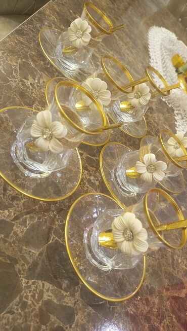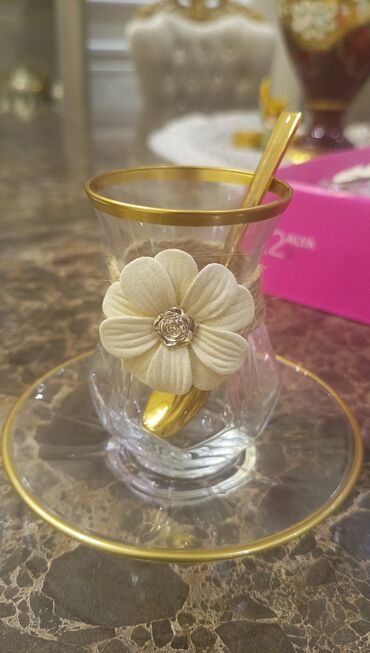 Zərif şüşə çay dəsti, hər biri qızılı haşiyəli, gül formalı bəzəklərlə işlənmiş və uyğun nəlbəki ilə tamamlanmış stəkanlardan ibarətdir. Dəstə daxil olan qızılı rəngli qaşıqlar ümumi estetik görünüşü tamamlayır. Kirayəsi 15 azn 12 nəfərlik stəkan, nəlbəki, qaşıq. Ünvan Sumqayıt şəhəri