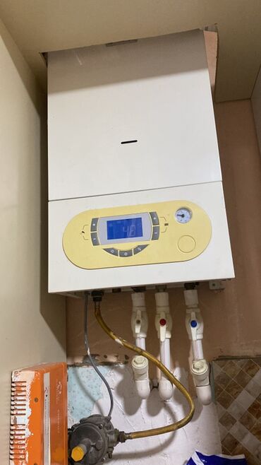 - Divardan asılan qazla işləyən qazan (elektron idarəetmə paneli, LCD ekran, manometr). Paneldə su temperaturu göstərilir, +/- düymələri, rejim seçimi və menyu naviqasiyası üçün düymələr mövcuddur.