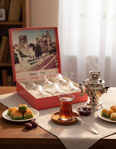 Şüşə stəkan və boşqab dəsti – armudu forma, şəffaf şüşə. Üzərində yazılar: - “Hadi sohbet edelim” - “Daha çok anlat!” - “Bir çay daha…” Xüsusiyyətlər: - Klassik armudu dizayn, nazik kənar - Şəffa...