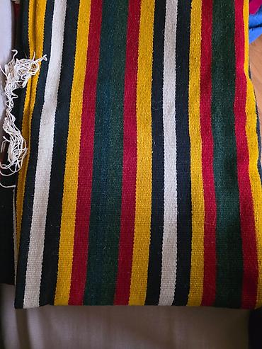 - Parça 1: çoxrəngli (sarı, qara, qırmızı, yaşıl, krem) eninə zolaqlı, əl toxumasını xatırladan qalın toxumalı parça; kənarda saçaqlı sonluq