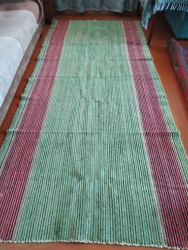 - Parça 2: iri ölçülü döşəmə örtüyü/xalça tipli toxuma; əsas rəng açıq yaşıl, yan haşiyələr çəhrayı-qara zolaqlı; incə eninə zolaqlar; kənarları düyünlü