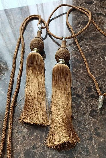 - Komplektə daxildir: 1 cüt dekorativ saçaqlı tutacaq (qızılı detallı) – pərdəni yanlara yığmaq üçün.