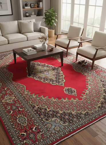 Qırmızı tonlarda klassik naxışlı xalça - Üslub: Şərq/Pers motivləri ilə zəngin klassik dizayn, mərkəzdə böyük medalyon, ətrafında simmetrik floral və geometrik elementlər. - Rənglər: Dərin qırmızı...