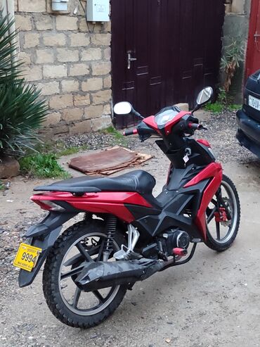 Motosiklet – şəhər içi gediş-gəliş və gündəlik istifadə üçün praktik model. Xüsusiyyətlər: - Yanacaqla işləyən, 1 silindrli mühərrik - Ön və arxa amortizatorlar - Mexaniki ötürmə (ayaqla dəyişmə) ...