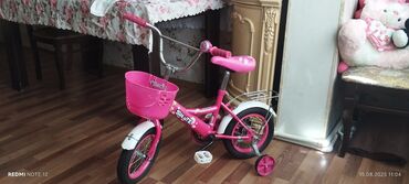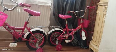 Uşaq velosipedi – kiçik ölçülü, çəhrayı rəngdə. - Çərçivə: polad, aşağı enişli. - Təkərlər: ön və arxa şinlər qalın profilli, kiçik ölçü (təxminən 12”). - Köməkçi təkərlər: arxada iki ədəd təlim t...