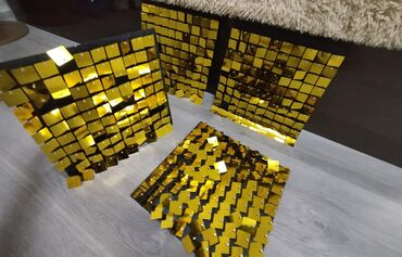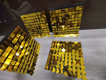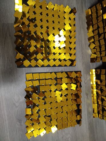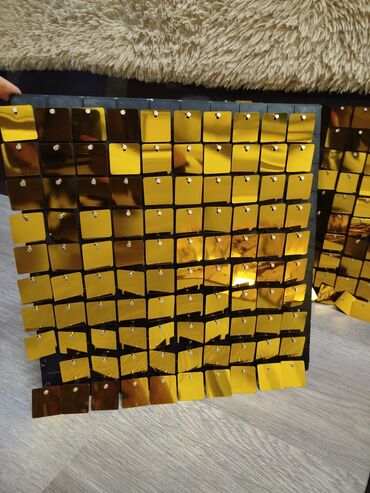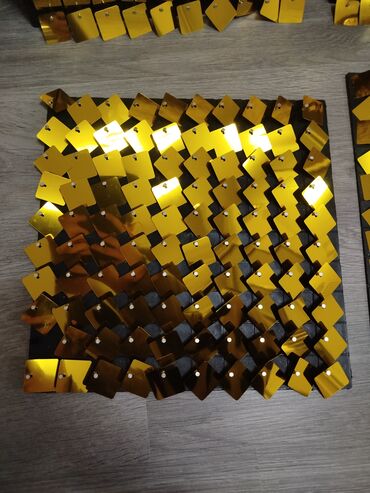 Qızılı rəngli, kvadrat formalı seqmentlərdən ibarət dekorativ panellər. Hər bir seqment qara altlığa bərkidilmişdir və sərbəst hərəkət edərək işıqla oynayır, bu da dinamik və cəlbedici bir görünüş yaradır. Bu panellər tədbirlər, səhnələr, mağaza vitrinləri və ya ev dekorasiyası üçün divar bəzəyi kimi istifadə oluna bilər. Parlaq qızılı səth hər hansı bir məkana zəriflik və parıltı qatacaq.