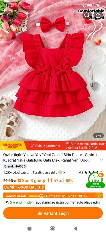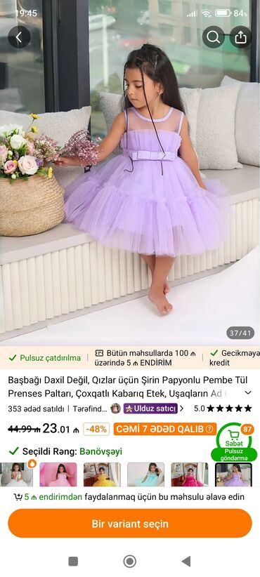 Uşaq geyimləri xüsusi hazırlanıb və geyinilməyib yenidir. Məhsul təsviri: - Qız uşaqları üçün zərif ziyafət donları. - Bənövşəyi model: üst hissə parıltılı payetlərlə, ətək hissəsi atlas parça, ya...