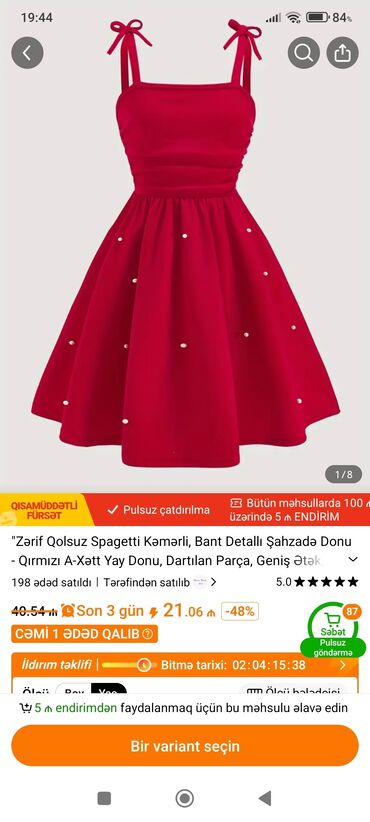 Qırmızı qız uşağı paltarı - Brend: Nazar Baby (etiket üzərində) - Rəng: Canlı qırmızı - Dizayn: Büzgülü açıq-yuvarlaq yaxa, şar formalı uzun qollar, beldən aşağı geniş qatlannmış ətək - Aksesuar:...