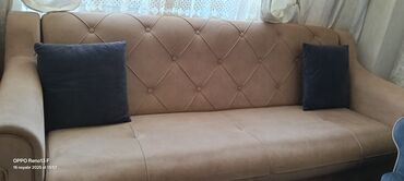 Qonaq otağı üçün mebel dəsti - Divan: Bej-qəhvəyi tonlarda klassik düz xəttli model. Yan tərəfləri yumşaq, ön panelində dekorativ naxış vurğusu var. Üstündə naxışlı üç iri arxa yastıq və iki ədəd ...