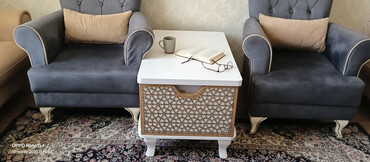 Mebel dəsti – yumşaq mebellər və stullar - 3 nəfərlik divan: açıq krem rəngli, naxışlı üzlük, hündür bel hissəsi və dərin oturacaq, taxta dekorlu yanlıqlar. 2 ədəd boz dekor yastığı ilə. - 2 ədəd ...