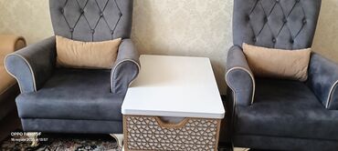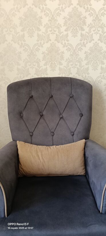 - 2 ədəd tünd boz rəngli balaca “wingback” tipli kreslo. Arxalıqda romb düyməli işləmə, krem rəngli bordür xəttləri, hər birində bir ədəd uzun krem yastıq.